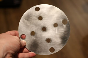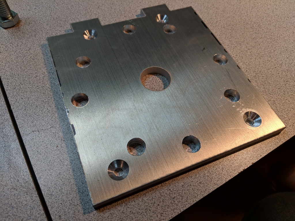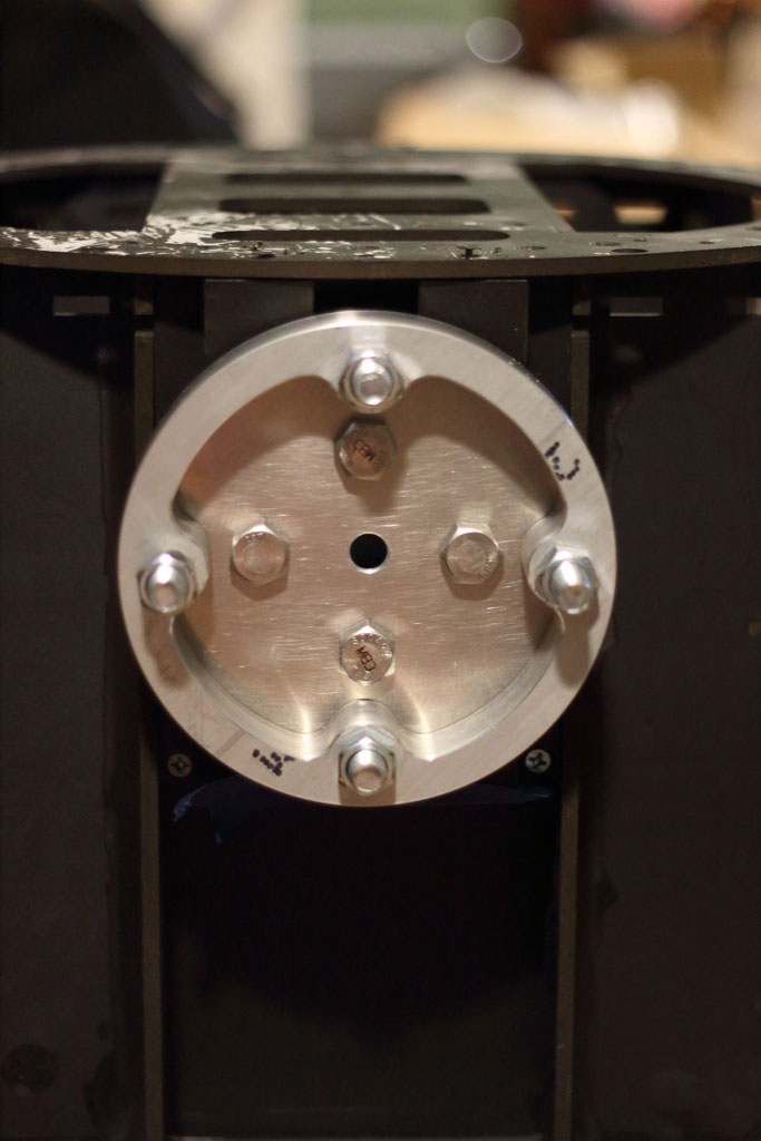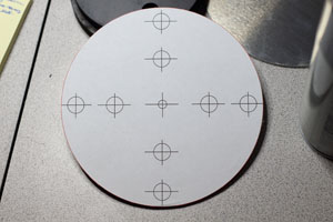 I next created a drill template in Adobe Illustrator, attached it with some spray adhesive, and then drilled everything out. All holes accommodated 1/2" bolts. The center hole is for the electrical wiring. The inner holes are for the JAG stops. The outer holes are for the flange.