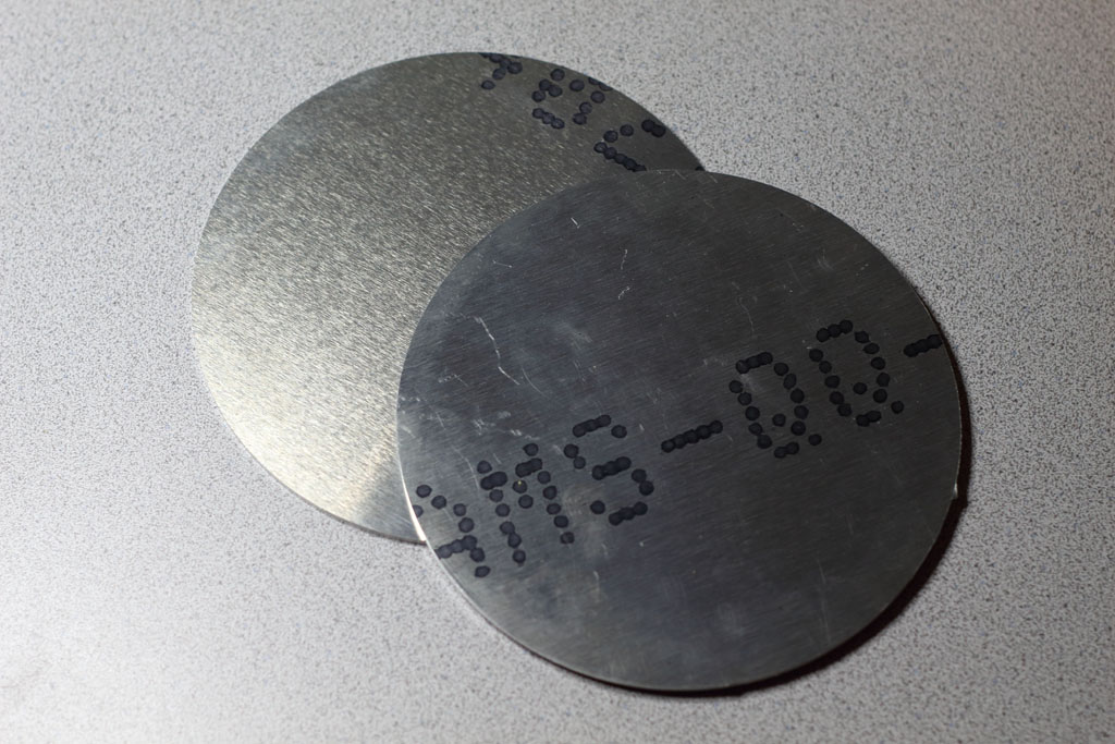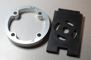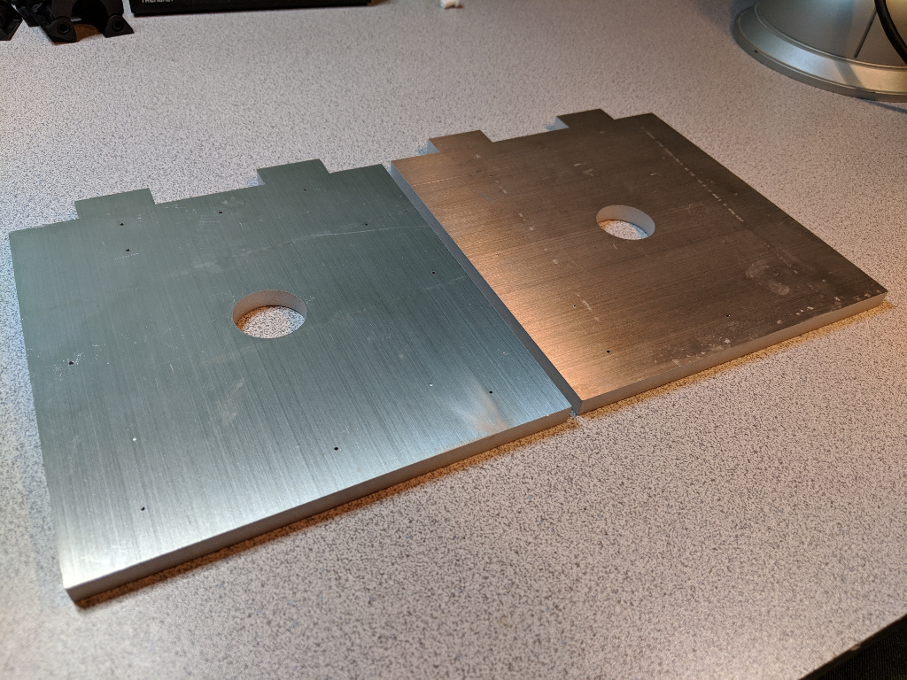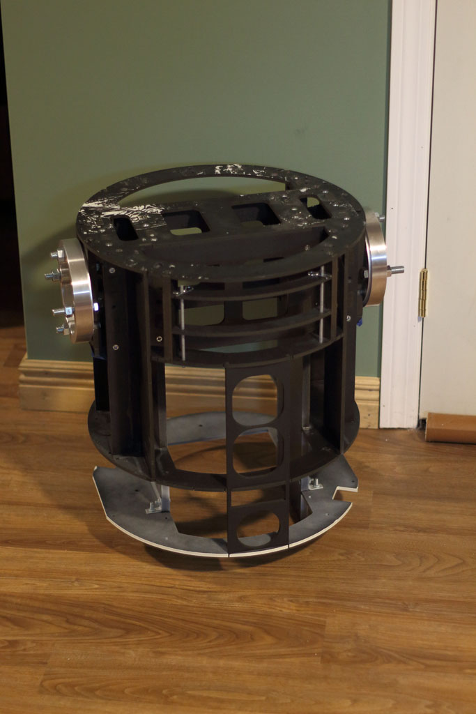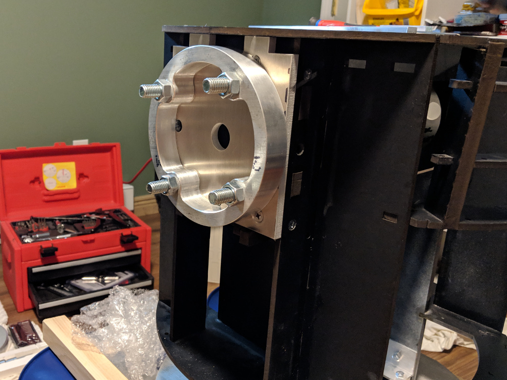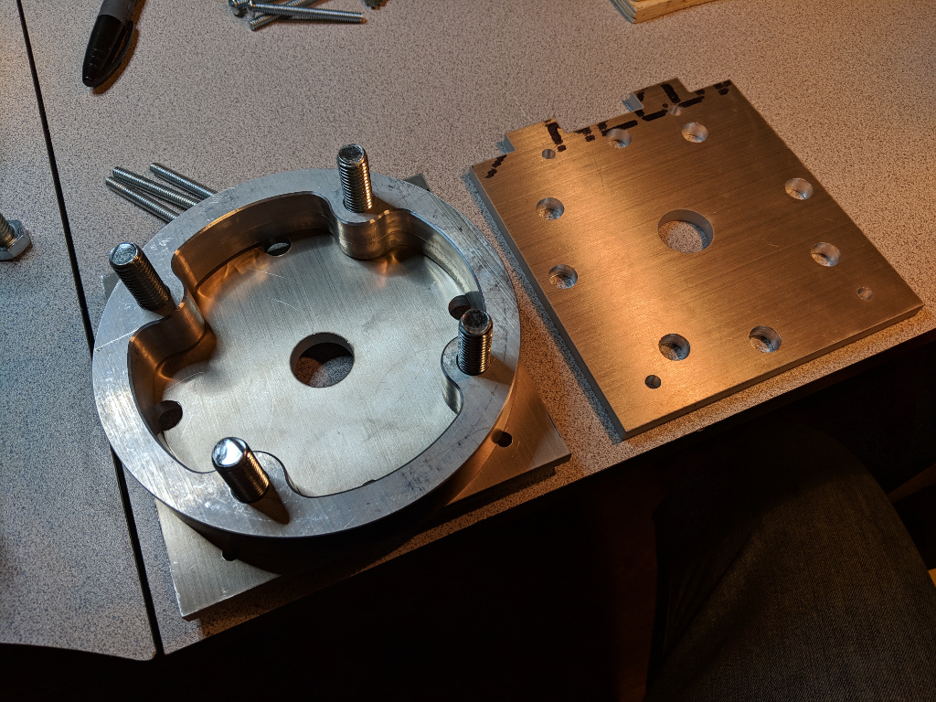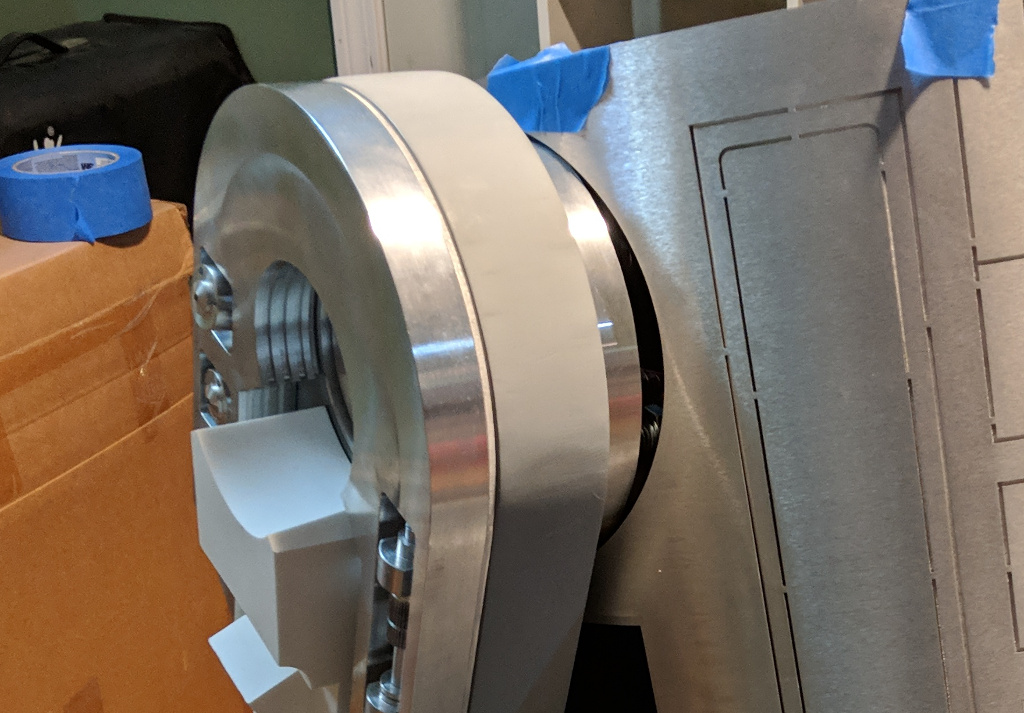 I was pretty proud of this solution. For months I scooted R2 around like this, letting friends and family drive him around the basement (where I work). All the while, I was unaware of a problem that was about to knock the builder-hubris right out of me. The day came to test mount the skins. All I really wanted to do was to make sure the frame and the skins were up to spec. So I wrapped the front skins around the frame, carefully aligning them so that the front cut outs were perfectly centered, and then I taped the skins into place. I took one step back and my jaw hit for the floor. There were awful gaps between the skins and the shoulder flanges. ![]() My first thought was that my 1/8" disks were too thick. But I took some measurements and found the gap was greater than 1/8" in places. Thinner adapters, or even no adapters, wouldn't have mattered. A gap of some size would still exist. I needed to take another pass at this problem. Side Note: To this day, I still haven't learned how the A&A folks make this work. I know a number of builders have used this frame successfully. So it's a mystery to me. I'd be grateful if any of those folks could reach out to me and tell me why this wasn't an issue for them. :-P The SolutionMy final solution was to design a custom aluminum mounting plate for the flange. I considered designing a drop-in replacement for the frame's A&A JAG stops. But after some measuring and experimentation, I didn't feel confident that I could create a workable solution that could accommodate the bolt circle of the shoulder flange, be thin enough to eliminate the gaps, and not actually get in the way of the skins. I decided to throw out the JAG stops and put my mounting plate right against the frame. There would still be a small gap between the aluminum plate and the frame's shoulder plate, which would accomodate the heads of the bolts for the flange and the legs. I iterated on the design a few times before I found one that would work well. Each time, I prototyped it using a piece of plywood. The drawing for the final design can be downloaded HERE. The plates were waterjet cut out of 5/16" aluminum by Big Blue Saw. This is what they looked like fresh out of the box.