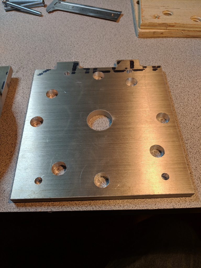 The teeny tiny holes you see on the plate in the photos above were to serve as guides for where to drill. The topmost and bottommost holes were drilled out for 1/4" bolts. I used a 1/2" bit for the flange/leg bolt holes. ![]()
